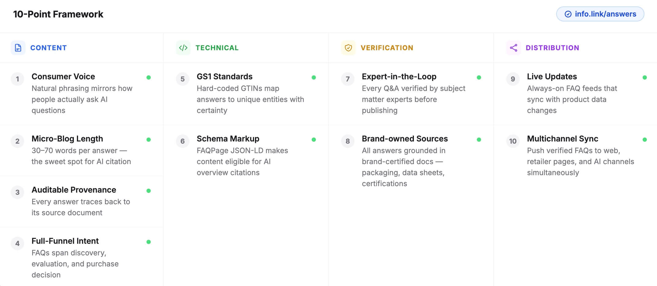 Most FAQs today meet about 2 out of 10 requirements for AI readiness. The gap between what brands have and what AI needs is wide. The 10-Point Playbook covers four dimensions: content quality, technical markup, verification, and distribution.